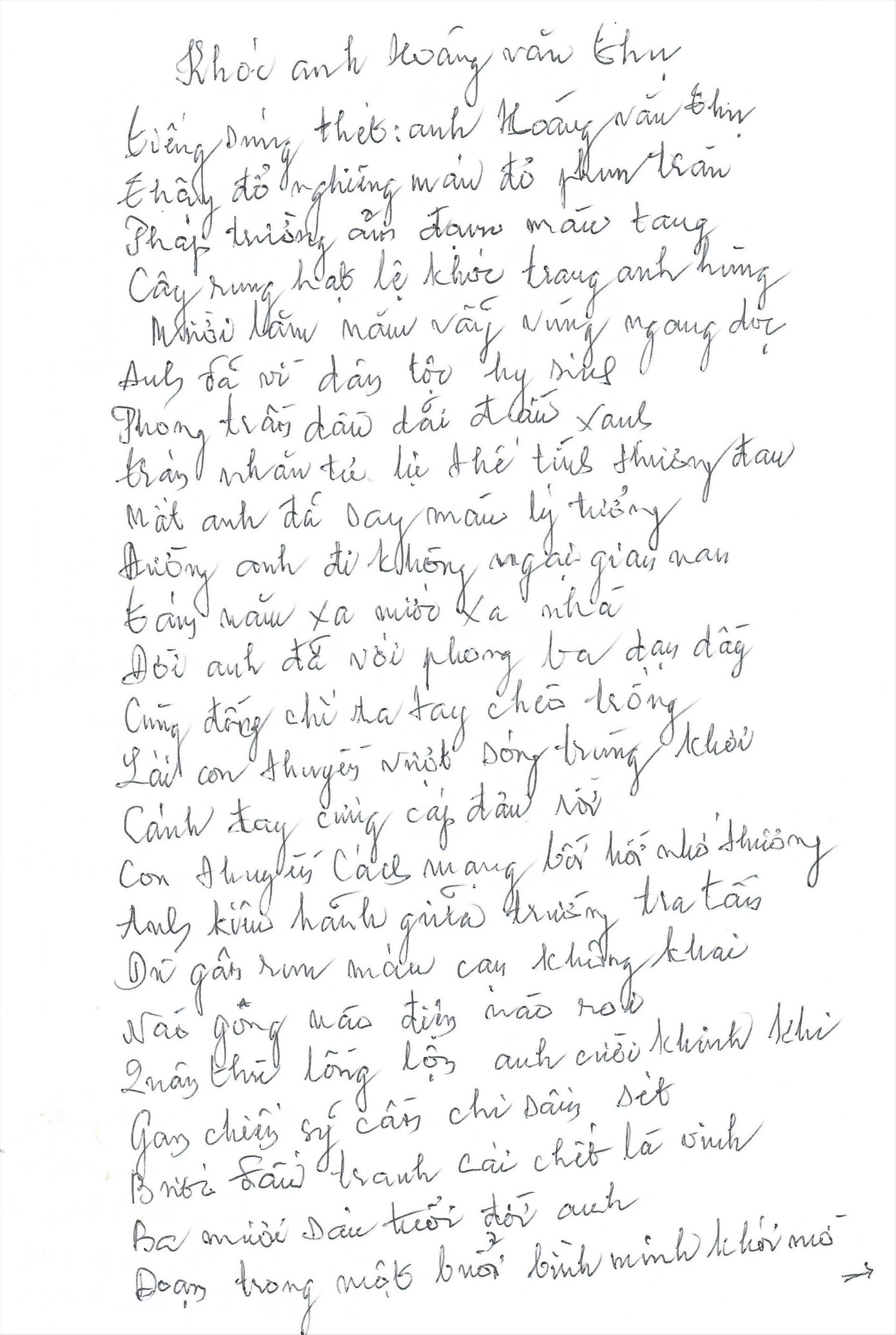 Tôi cầm tờ giấy bà Tú Anh chép lại bài thơ “Khóc anh Hoàng Văn Thụ” lên xem. Bài thơ khá dài, gần hết hai trang khổ giấy A4 nhưng được bà Tú Anh chép thẳng hàng, không gạch xóa. Chủ nhân cho biết, sau 75 năm kể từ khi biết đến bài thơ này, bà đã chép lại bài thơ một cách liền mạch do vẫn thuộc lòng. Rồi bà kể, năm bà 11 tuổi (năm 1944), có thời gian, bà thấy cha mình rất buồn, như mất người thân trong gia đình.