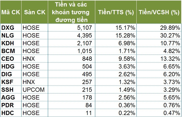 | Top DN BDS có Tiền và tương đương tiền nổi bật trong kỳ. Nguồn dữ liệu: BCTC các DN BDS |