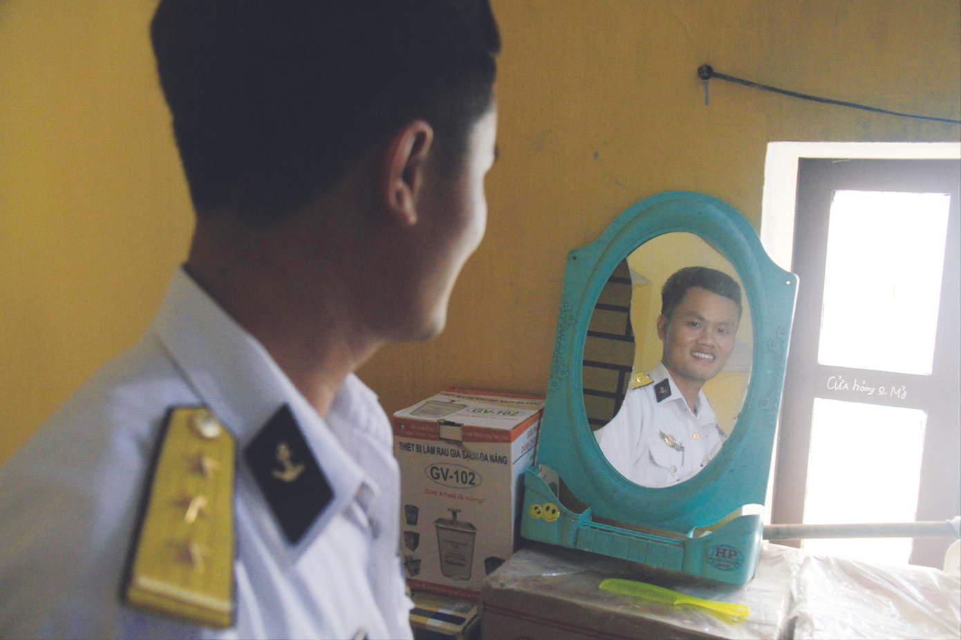 Tháng 1/2018, chúng tôi có dịp thăm đảo Tốc Tan C trong hành trình thăm, tặng quà, chúc Tết cán bộ, chiến sĩ ở Trường Sa. Dịp này, biển động dữ dội. Để vào được đảo khá vất vả và nguy hiểm. Sóng biển, gió biển quần thảo dữ dội. Đảo Tốc Tan C khá hẹp, phòng họp nhỏ. Trong lúc Thủ trưởng đoàn công tác tặng quà, chúc Tết thì anh em phóng viên được dịp “lượn” một vòng. Tôi cứ để ý mãi chiếc gương vỡ gần một nửa, được anh em giữ gìn.