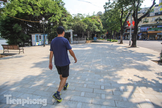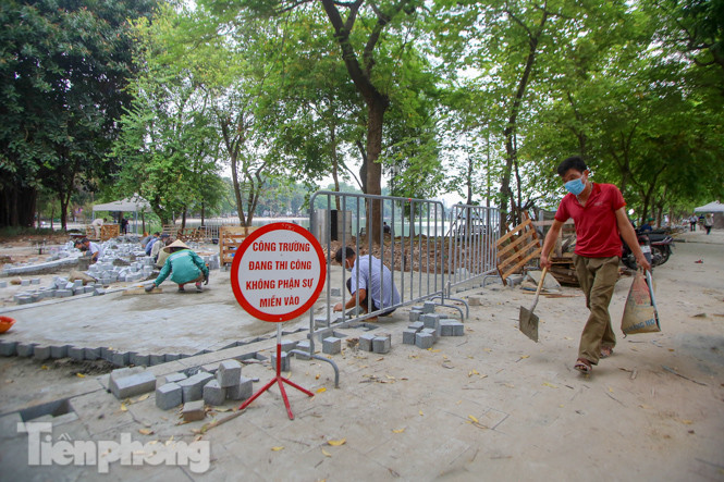 Xung quanh khu vực công trường đều bố trí hàng rào chắn barie, biển cấm, đơn vị thi công cho biết dành lối vỉa hè đã hoàn thành cho người dân tiện đi lại quanh hồ.