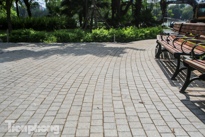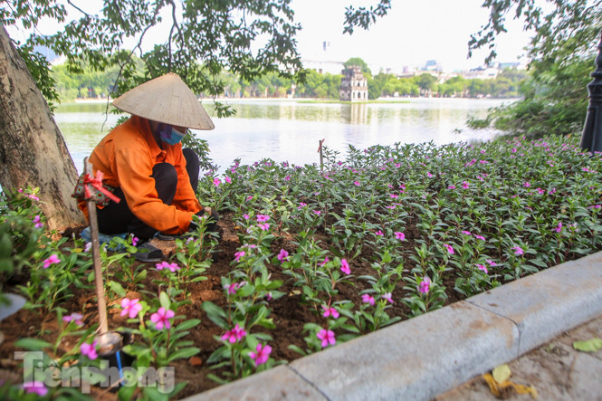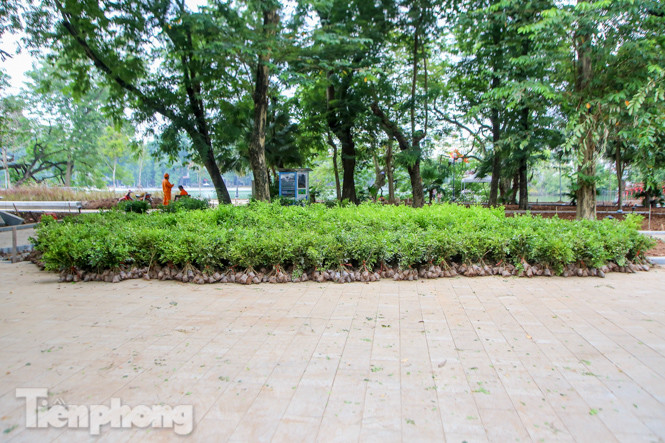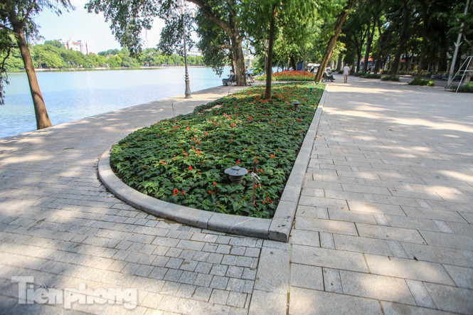 Song song việc lát đá vỉa hè "tăng tốc về đích", các hạng mục bồn hoa đang được trồng cây, trải thảm cỏ với nhiều loại khác nhau, tăng mỹ quan vẻ đẹp cho hồ Hoàn Kiếm.