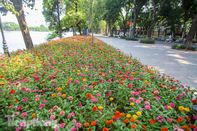 Bồn hoa đa sắc màu bắt mắt dọc bờ hồ Hoàn Kiếm.