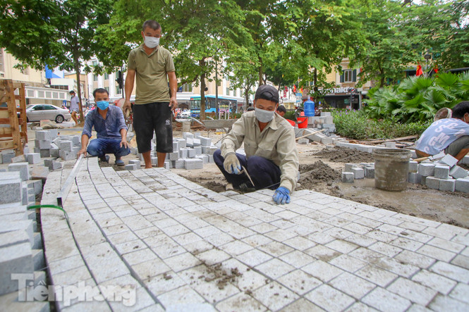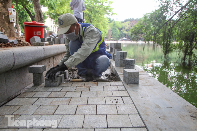 Đơn vị thi công đang gấp rút, tăng cường nhân công hoàn thành nốt các hạng mục lát đá vỉa hè hồ Hoàn Kiếm để kịp chào mừng những ngày lễ lớn của Thủ đô.
