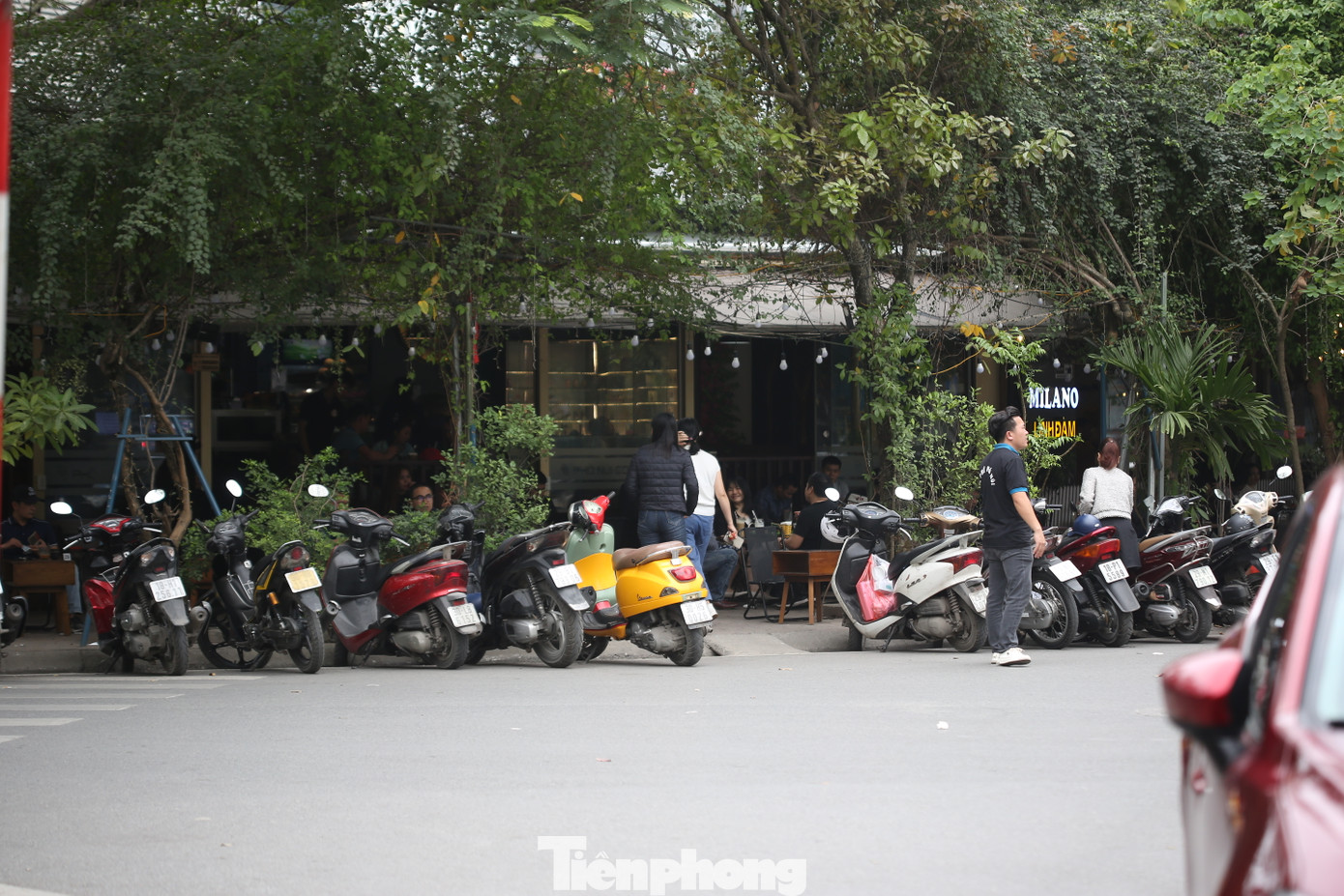 | Một điểm đỗ xe sử dụng hết vỉa hè, đẩy người đi bộ xuống lòng đường ở khu đô thị Linh Đàm. Ảnh: Trường Phong |
