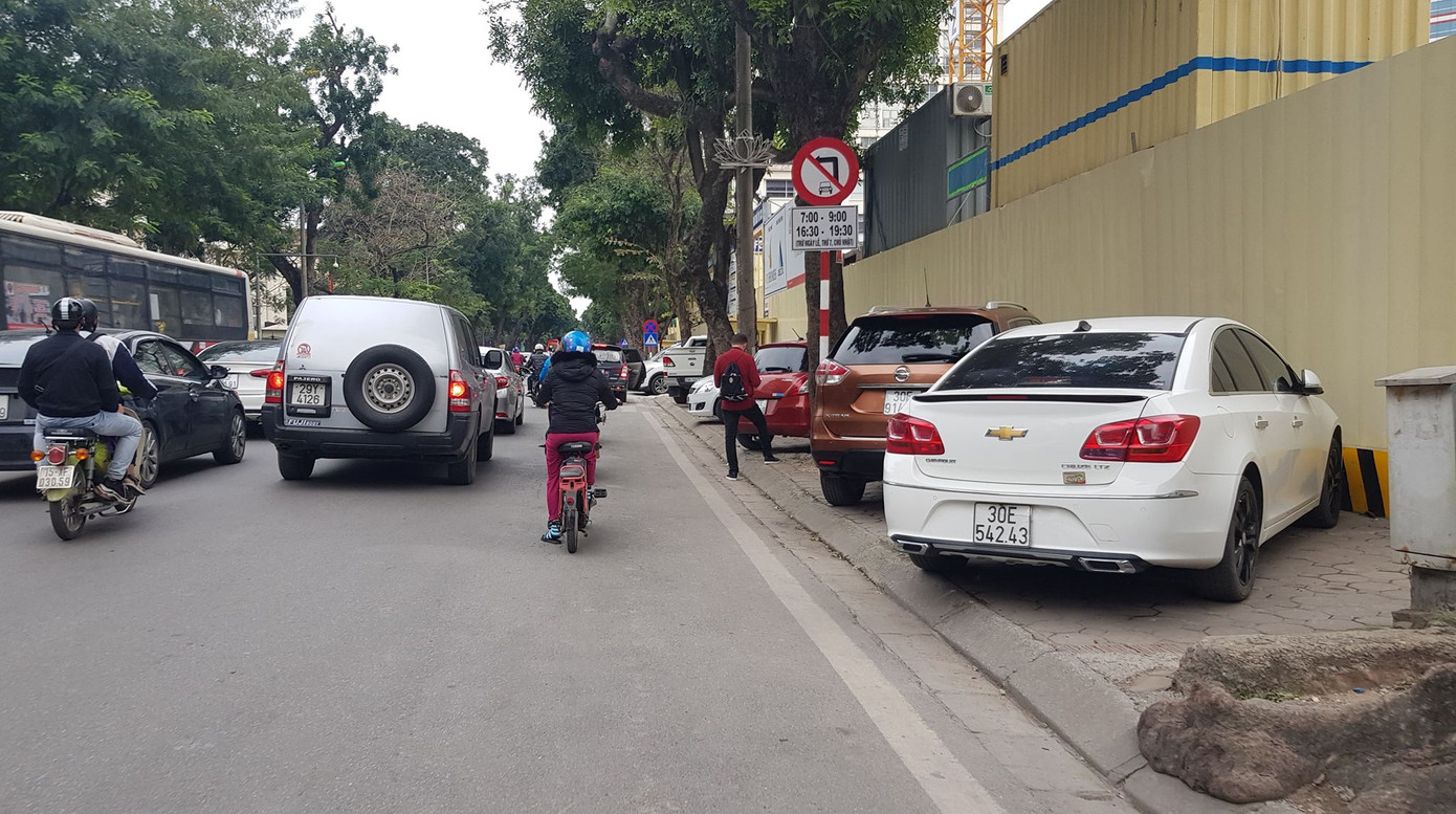 Trên trục đường Trần Hưng Đạo (quận Hoàn Kiếm), hàng loạt ô tô được xếp đỗ trên vỉa hè, khiến người đi bộ không còn chỗ lưu thông.
