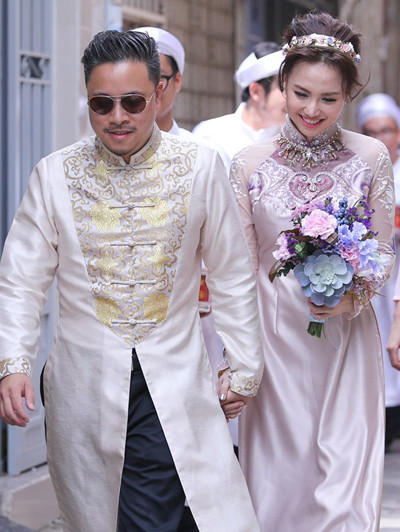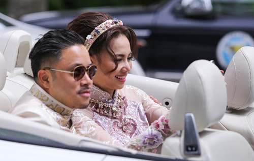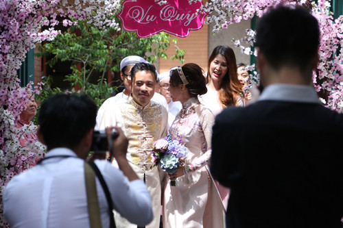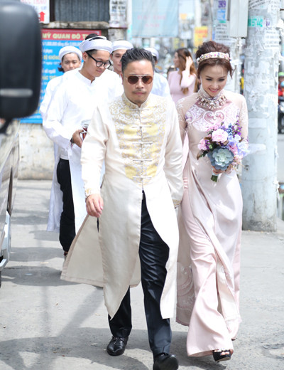 Victor Vũ nắm tay Đinh Ngọc Diệp tiến đến cổng nhà gái.