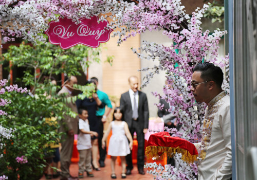 Victor Vũ đứng chờ ngoài cổng nhà gái để đến giờ lành cúng tổ tiên.