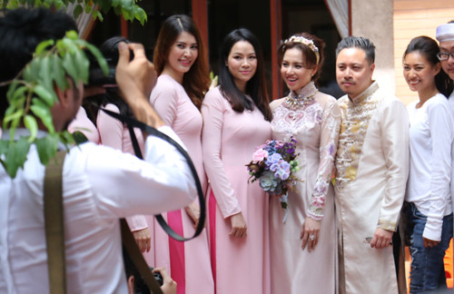 Sau buổi lễ vu quy, cặp nghệ sĩ cùng người thân, bạn bè chụp ảnh trước nhà bên nội của Đinh Ngọc Diệp.