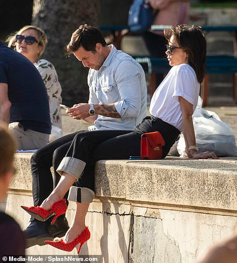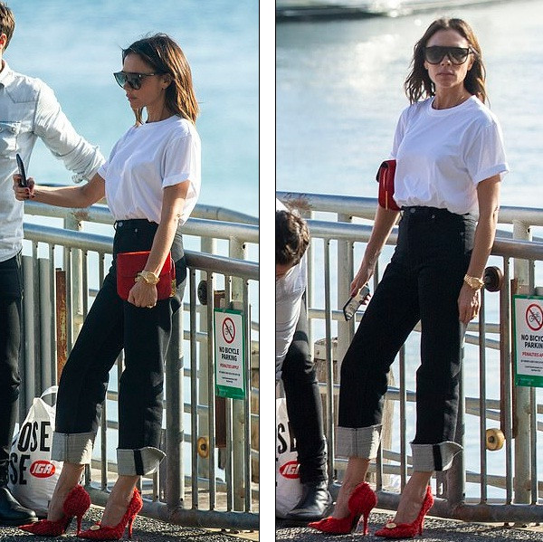Victoria diện giày cao gót ngồi ngắm các con bên bờ biển ở Sydney cuối tuần qua.