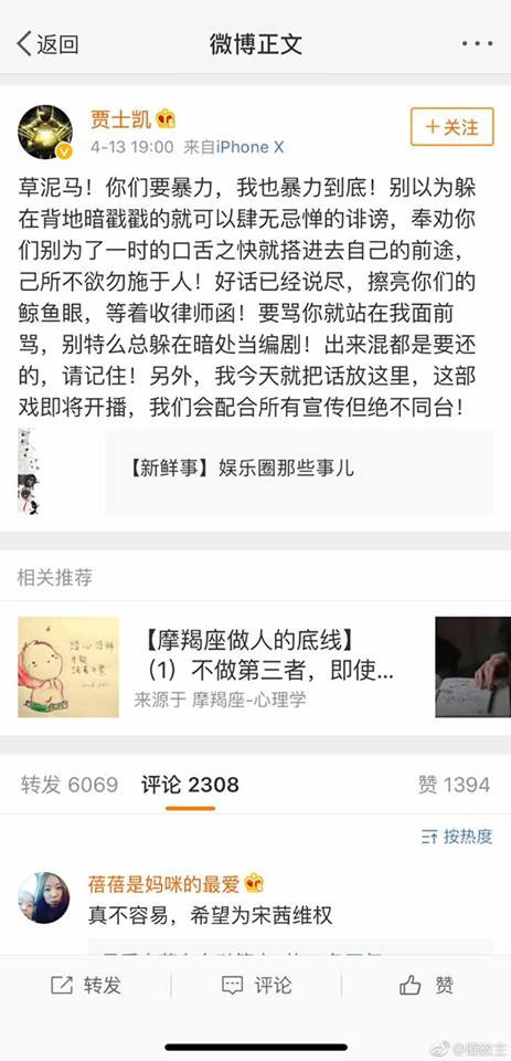 Mới đây, quản lý của Victoria (Tống Thiến) bất ngờ đăng tải một status trên Weibo ám chỉ một "đoàn đội" khác đang âm thầm hãm hại mình, kèm theo nhiều từ ngữ nặng nề. Đặc biệt, cuối bài đăng, Giả Sĩ Khải dọa sẽ kiện "Cá voi" ra tòa và nhấn mạnh: "Bộ phim sắp phát sóng, chúng ta sẽ phối hợp tuyên truyền nhưng tuyệt không đi chung”.