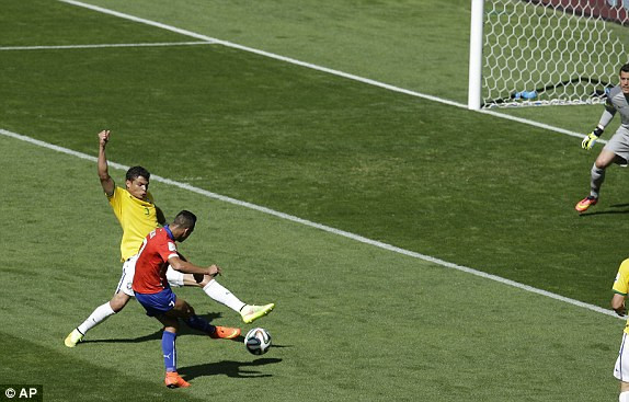TPO - Phút 32, xuất phát từ pha trả bóng về vụng về của Hulk (7-Brazil), Vargas (11-Chile) cướp được bóng. Cầu thủ này nhanh chân chuyền vào vòng cấm cho Sanchez dứt điểm chìm, đưa bóng vào góc xa, gỡ hòa 1-1.
