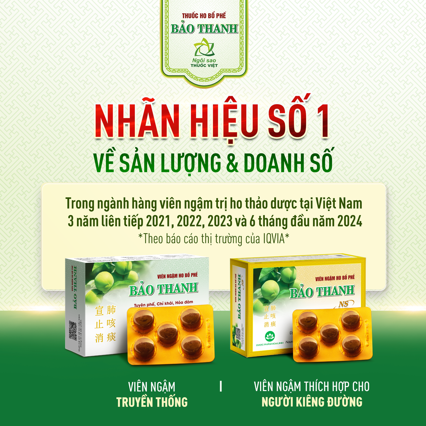 Từ dấu ấn tiên phong ứng dụng thành công công nghệ sản xuất kẹo trong sản xuất thuốc cách đây gần 20 năm, đến nay, viên ngậm ho bổ phế Bảo Thanh vẫn giữ vị thế số 1 trên thị trường về dạng kẹo thuốc Lozenges, với tác dụng nổi bật: không chỉ trị ho, hóa đờm, mà còn bổ phế, ngăn ngừa tái phát. Đó là lý do viên ngậm ho bổ phế Bảo Thanh trở nên quen thuộc, gắn bó và đồng hành thiết yếu trong việc chăm sóc sức khỏe của hàng triệu gia đình trên khắp Việt Nam.