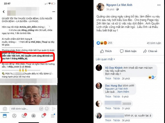 Rơi vào tình huống “dở khóc dở cười” khi bất ngờ có tên trong quảng cáo chữa bệnh nhạy cảm, diễn viên Việt Anh nổi cơn thịnh nộ và yêu cầu trang fanpage này phải xử lý trong vòng 24 giờ. “Quảng cáo càng ngày càng bố láo, làm điểm vụ này cho sau này bớt kiểu lừa đảo. Cho trang page này 24h liên lạc và xử lý việc này dứt điểm. Anh Quyền Linh chắc cũng mất ăn mất ngủ. Liều lĩnh và thiếu hiểu biết thật sự”- Việt Anh bức xúc.