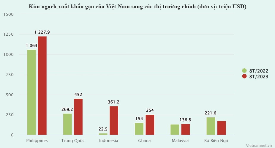 Ngoài ra, xuất khẩu gạo sang Trung Quốc cũng tăng 45,6%, sang Malaysia tăng 50,6%, sang Ghana tăng 63,8%...