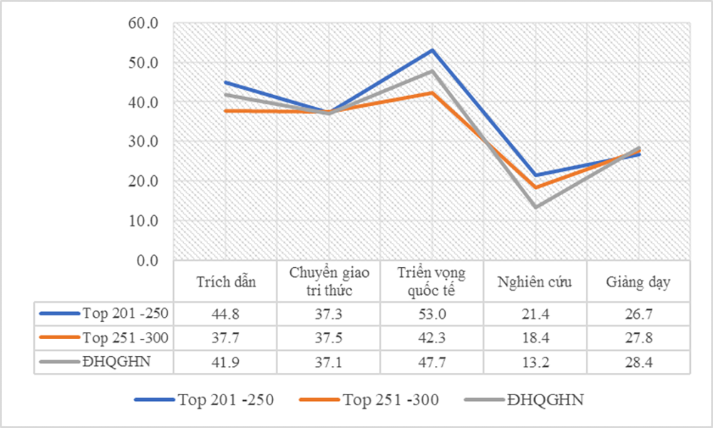 Dưới đây là bảng đối sánh điểm đánh giá của ĐHQG Hà Nội và điểm trung bình chung của nhóm cơ sở giáo dục xếp hạng 201 – 250 và nhóm 251 – 300 thế giới: