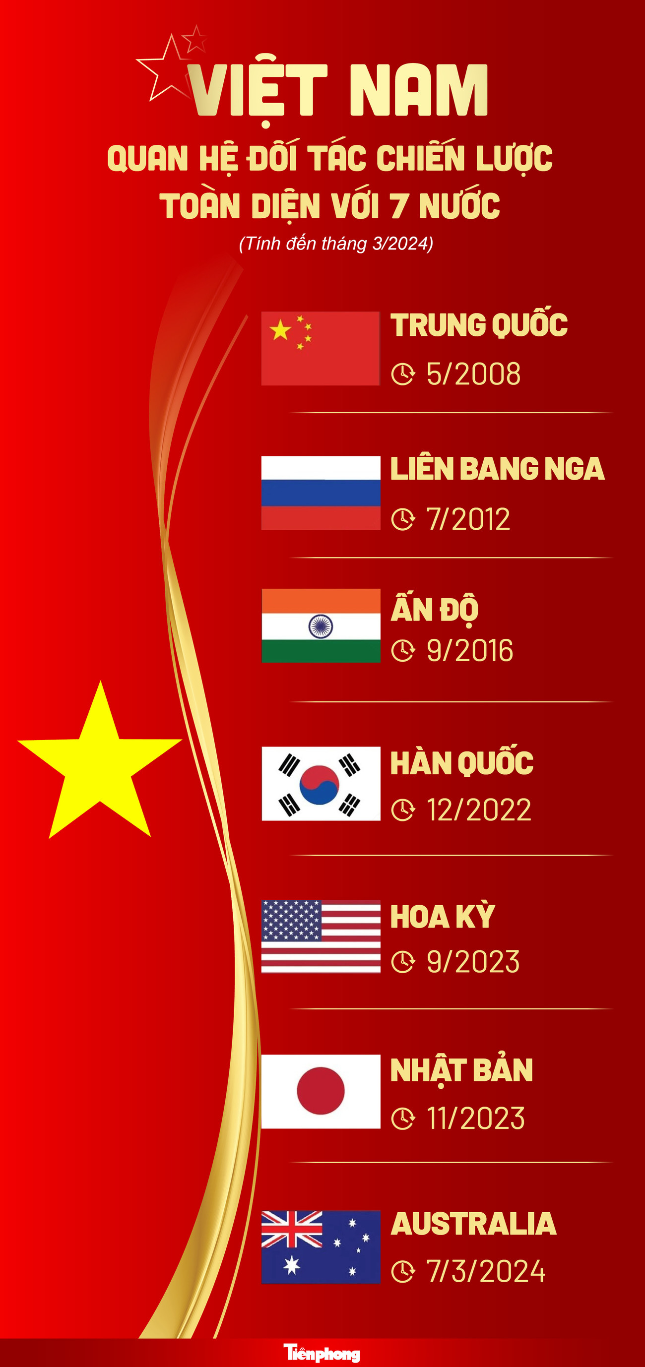 TPO - Sáng 7/3/2024, tại hội đàm ở Canberra, Việt Nam-Australia đã tuyên bố nâng cấp quan hệ ngoại giao lên Đối tác Chiến lược Toàn diện. Đến thời điểm hiện tại, Việt Nam có quan hệ Đối tác Chiến lược Toàn diện với 7 quốc gia.