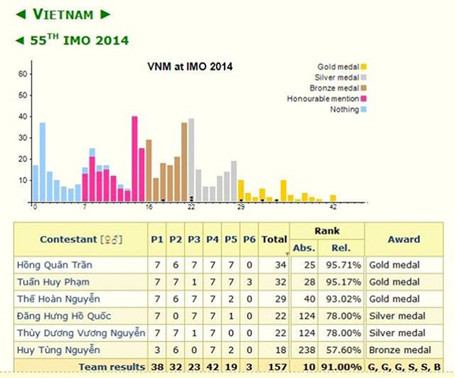 Các học sinh đoạt được huy chương Vàng là em Nguyễn Thế Hoàn - học sinh lớp 11 Trường THPT chuyên Tự nhiên (ĐH Khoa học Tự nhiên - ĐHQGHN); Phạm Tuấn Huy - lớp 12 Trường Phổ thông Năng khiếu - ĐHQG TPHCM và Trần Hồng Quân - lớp 12 Trường THPT chuyên Thái Bình (tỉnh Thái Bình).