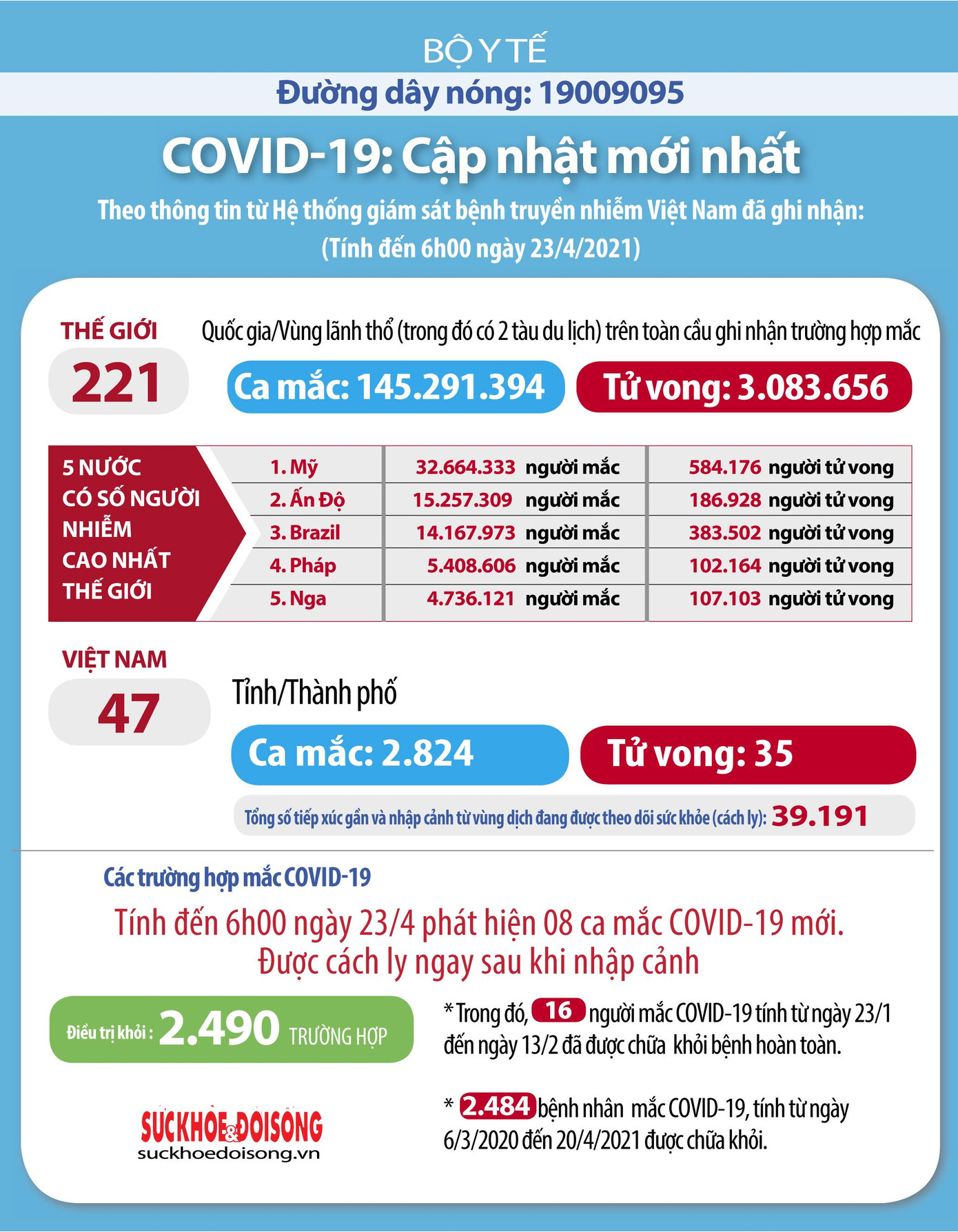 - Tính từ 18h ngày 22/4 đến 6h ngày 23/4: 08 ca mắc mới, đều được cách ly ngay sau nhập cảnh.