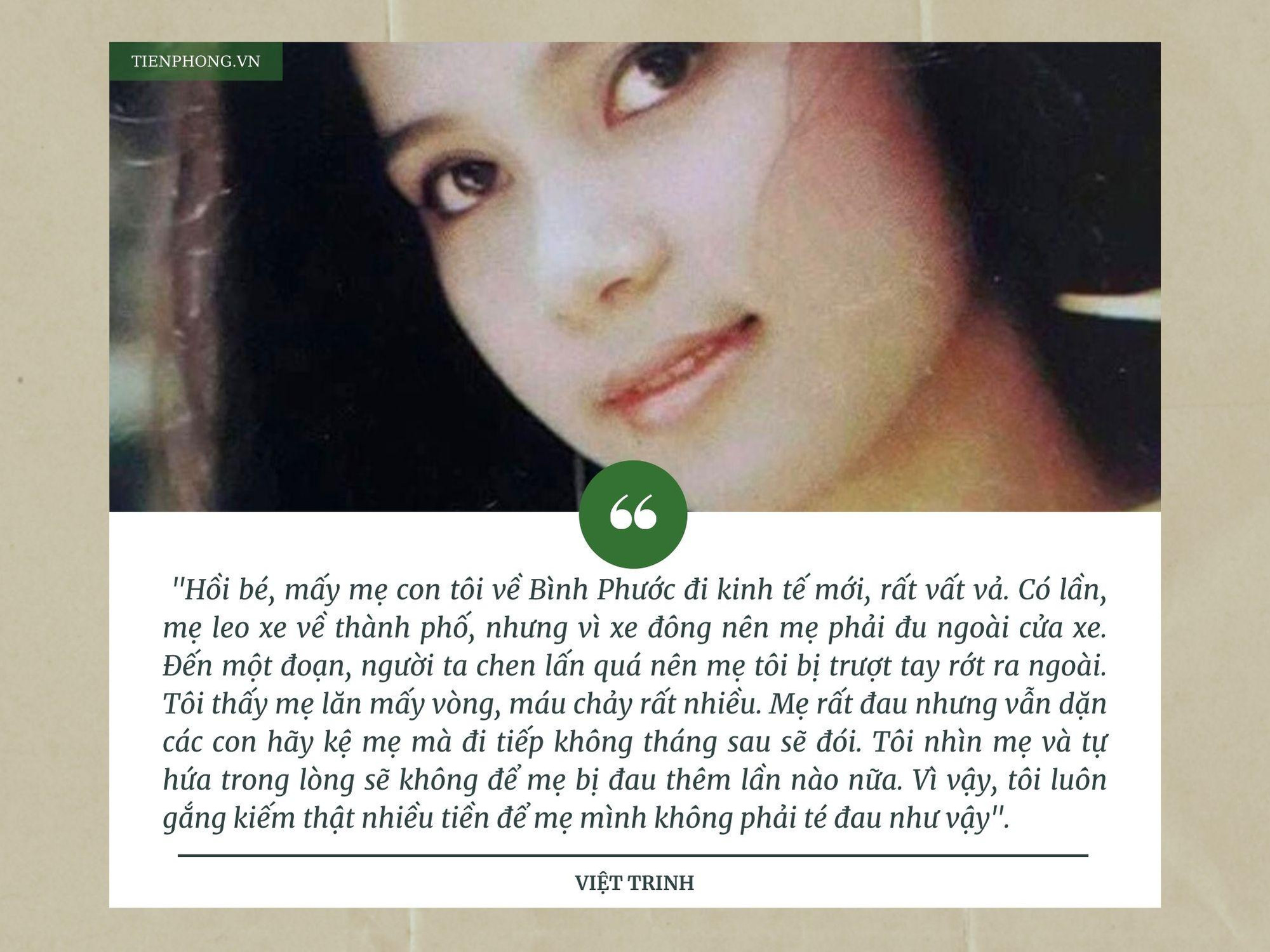 Trải qua một tuổi thơ đẫm nước mắt, Việt Trinh không bao giờ quên được quãng thời gian mẹ vất vả lo toan cho anh em cô có được cuộc sống đủ đầy. Nữ diễn viên bộc bạch nỗi lòng: “Người mẹ vĩ đại của con, con có phước lớn mới được làm con của má. Ước gì kiếp sau và nhiều kiếp nữa vẫn được làm con của má. Con nhớ má lắm má ơi”.