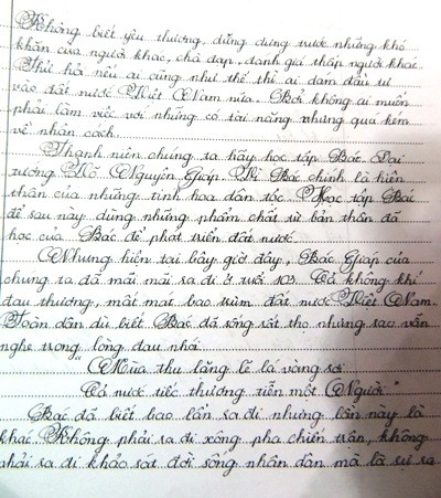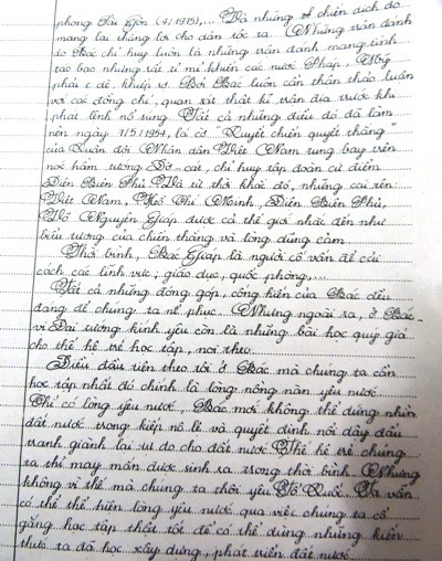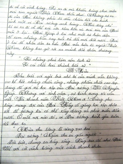 Bài viết về Đại tướng Võ Nguyên Giáp cùng những suy tư, liên hệ sâu sắc từ tấm gương anh hùng với nét chữ đều tăm tắp của Huệ Mai dài 6 trang giấy. Ngoài khả năng viết văn ở các thể loại như kể chuyện, tự sự... còn đòi hỏi người viết nắm vững kiến thức lịch sử, chiến sự, am hiểu thời cuộc và cả những triết lý sống già dặn.