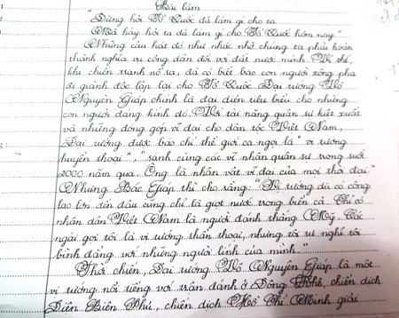| Nét chữ trong bài thi "Văn hay chữ tốt" viết về Đại tướng Võ Nguyên Giáp của em Châu Huệ Mai. |