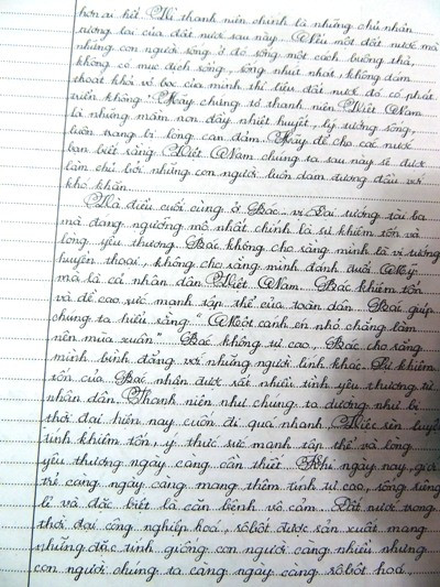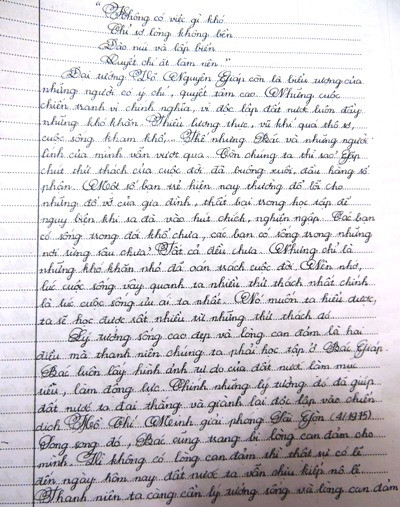 Đoạn văn trên trích từ bài văn vừa được trao giải Nhất cuộc thi "Văn hay chữ tốt" TPHCM lần thứ 14 của em Châu Huệ Mai, học sinh lớp 9/1, Trường THCS Hoàng Lê Kha (Q.6, TPHCM). Bài văn viết về lòng quả cảm, lý tưởng sống và đức hy sinh, khiêm tốn của cố Đại tướng Võ Nguyên Giáp.