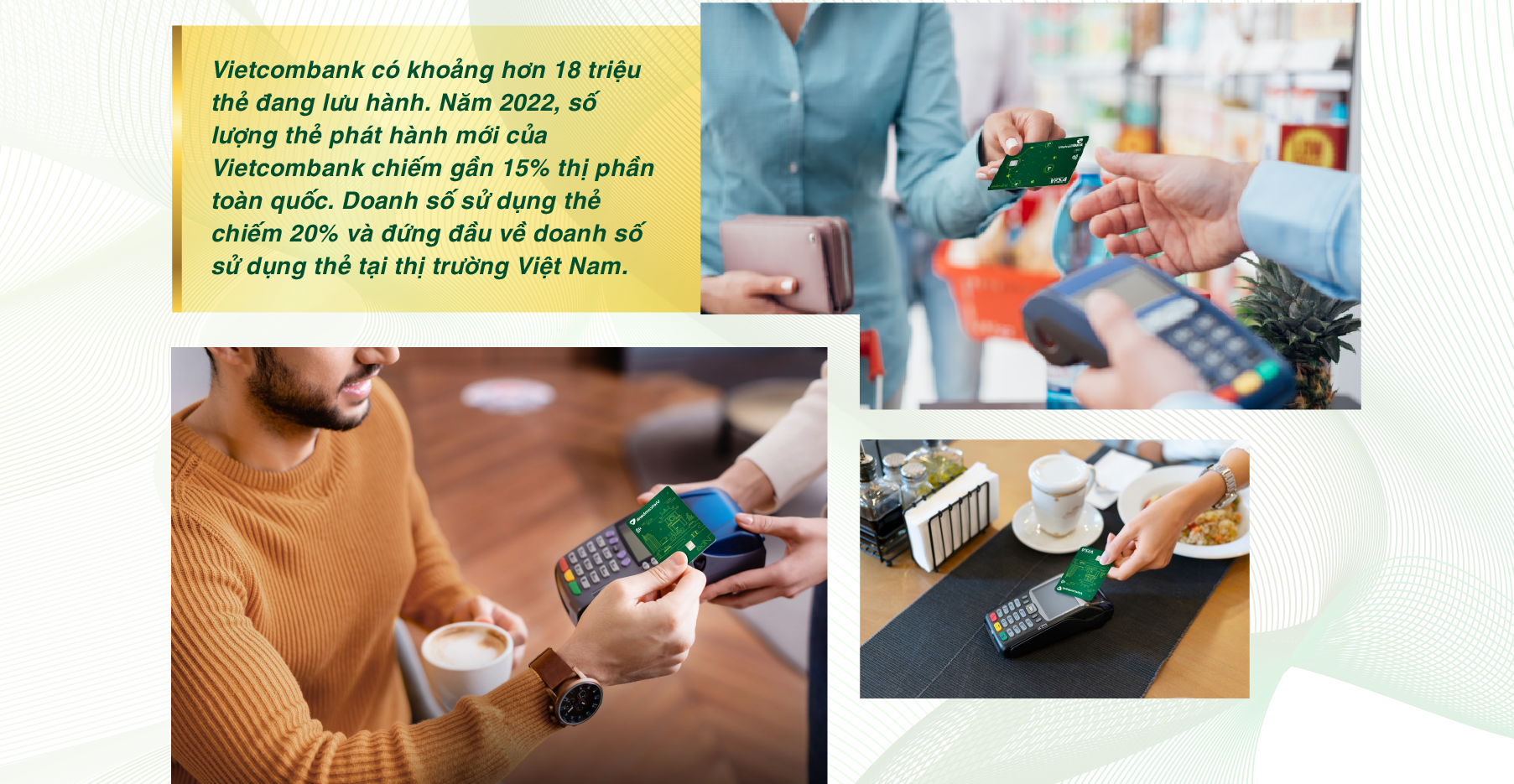 Giới hạn trong lĩnh vực thanh toán đã được bứt phá khi điện thoại di động, đồng hồ thông minh trở thành thẻ của khách hàng. Vietcombank triển khai công nghệ tokenization kết hợp cùng các giải pháp bảo mật tiên tiến của thiết bị di động, giúp khách hàng không lo quên thẻ, mất thẻ, lộ thông tin thẻ để tự do tận hưởng những tiện ích và ưu đãi từ thanh toán thẻ mang lại. Nhờ nỗ lực bền bỉ và tư duy đổi mới sáng tạo, sản phẩm dịch vụ tài khoản – thẻ - ngân hàng điện tử số hóa toàn trình của Vietcombank được khách hàng hưởng ứng mạnh mẽ, đặc biệt là nhóm khách hàng ưa thích công nghệ.
