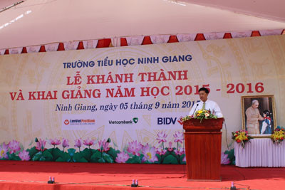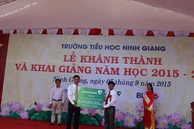 Tại buổi lễ, ông Phạm Quang Dũng đã thay mặt Ban lãnh đạo và tập thể cán bộ nhân viên Vietcombank trao biển tượng trưng với số tiền tài trợ 15 tỷ cho lãnh đạo xã Ninh Giang. Sau lễ cắt băng khánh thành ngôi trường mới và khai giảng năm học mới 2015-2016, Tổng giám đốc Phạm Quang Dũng và đoàn công tác của Vietcombank đã cùng các đại biểu đi thăm cơ sở vật chất tại các lớp học của Trường tiểu học Ninh Giang – ngôi trường được khánh thành vào đúng dịp khai giảng trong niềm hân hoan của thầy và trò nhà trường cùng đông đảo nhân dân, chính quyền xã Ninh Giang sau nhiều năm mong ước./.