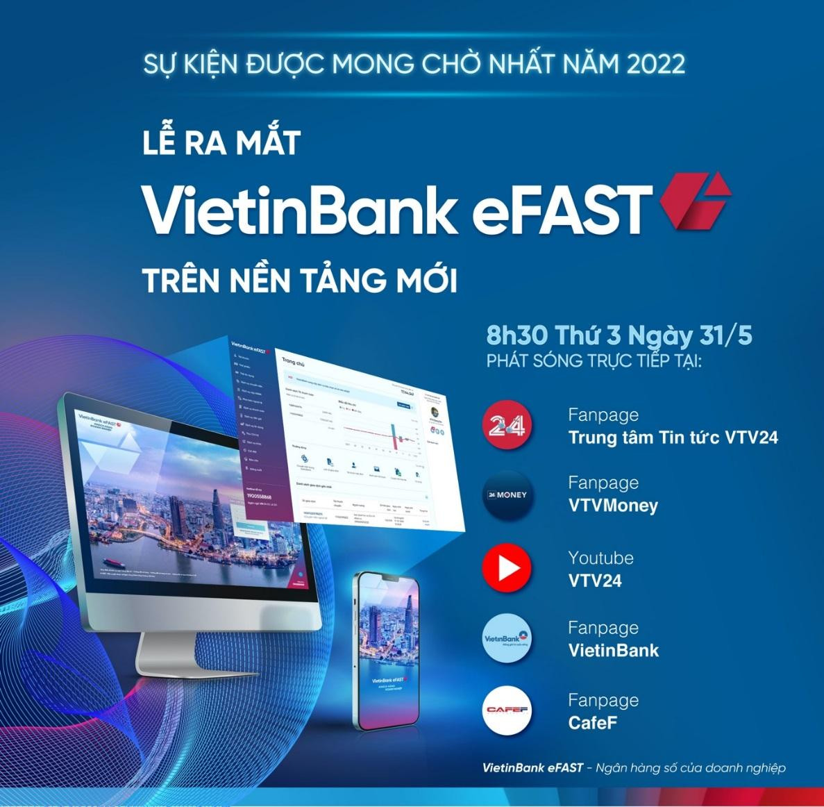 Box thông tin: Thông tin về “Trợ lý tài chính số” VietinBank eFAST sẽ được công bố chi tiết tại Sự kiện Ra mắt eFAST trên nền tảng mới tổ chức vào ngày 31/5 tới đây. Chương trình sẽ được livestream trực tiếp trên fanpage Trung tâm tin tức VTV24, fanpage VTVMoney, fanpage CafeF, fanpage VietinBank và trên kênh Youtube VTV24. Độc giả có thể truy cập địa chỉ https://www.facebook.com/VietinBank/ để biết thêm chi tiết.