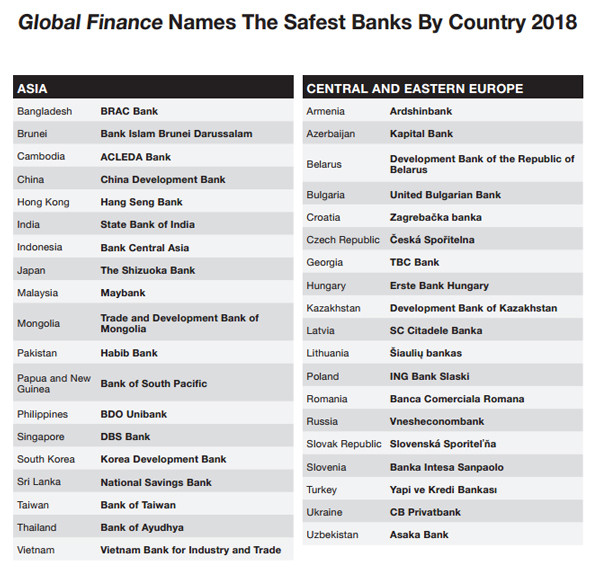 Global Finance đã vinh danh Ngân hàng an toàn nhất tại 106 quốc gia trên toàn thế giới năm 2018, thông qua việc đánh giá các xếp hạng ngoại tệ dài hạn từ các tổ chức Moody’s, Standard & Poor’s, Fitch cùng tổng tài sản của 1.000 ngân hàng lớn nhất toàn cầu. Bảng Xếp hạng Ngân hàng an toàn nhất đã chứng minh được chính sách quản lý rủi ro hiệu quả của các tổ chức tài chính trong việc hỗ trợ khách hàng và cổ đông chống lại các rủi ro phát sinh.