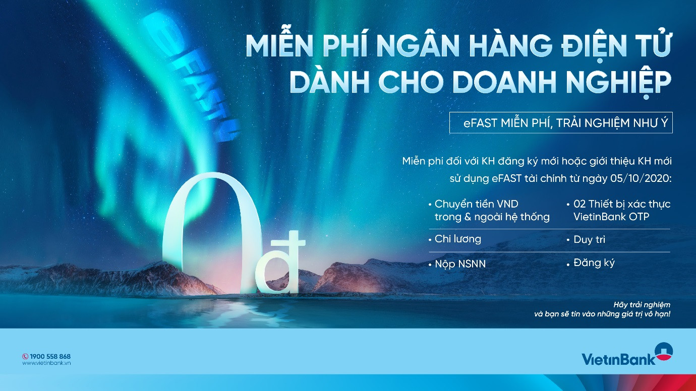 Từ 05/10/2020, VietinBank miễn toàn bộ phí giao dịch ngân hàng điện tử VietinBank eFAST cho các doanh nghiệp đăng ký eFAST tài chính mới: chuyển khoản VND trong và ngoài hệ thống; chi lương; nộp ngân sách nhà nước; 02 thiết bị xác thực VietinBank OTP và hàng loạt các loại phí khác.
