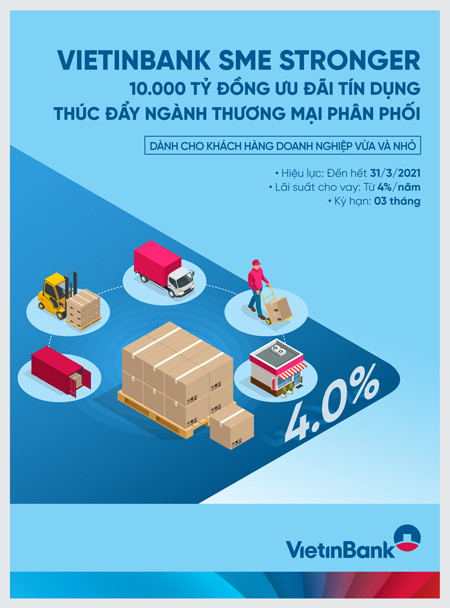 Ngoài ra, VietinBank tiếp tục đa dạng hóa ưu đãi nằm trong Gói “VietinBank SME Stronger” thông qua Chương trình “Ưu đãi tín dụng trung, dài hạn dành cho KHDN SME 2020” đến hết 31/3/2021. Chương trình nhằm phục vụ các KHDN SME có nhu cầu vay vốn trung, dài hạn bằng VND để phục vụ sản xuất kinh doanh và/hoặc đầu tư các dự án trung, dài hạn; không có nợ xấu trong thời gian 5 năm tại các tổ chức tín dụng sẽ được hưởng các ưu đãi lãi suất cố định chỉ từ 7,5%/năm tại VietinBank.