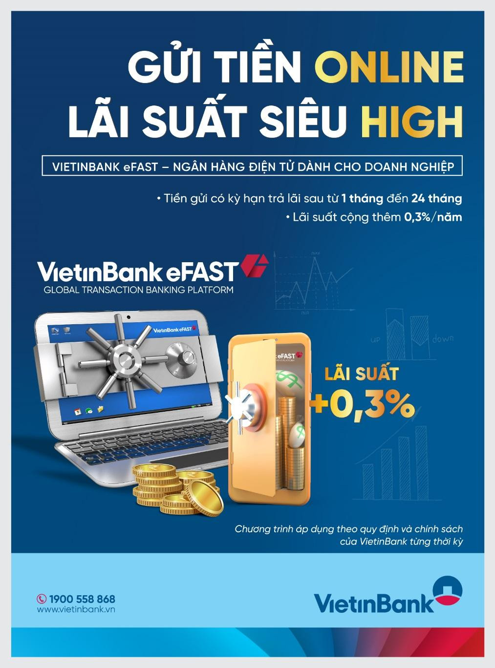 Quý khách hàng chỉ cần đăng nhập vào VietinBank eFAST và thực hiện giao dịch gửi tiền có kỳ hạn trả lãi sau VND từ 1 tháng đến 24 tháng để được hưởng ưu đãi cộng thêm 0,3% lãi suất theo chương trình. Lãi suất hiển thị trên VietinBank eFAST là mức lãi suất đã được cộng ưu đãi.