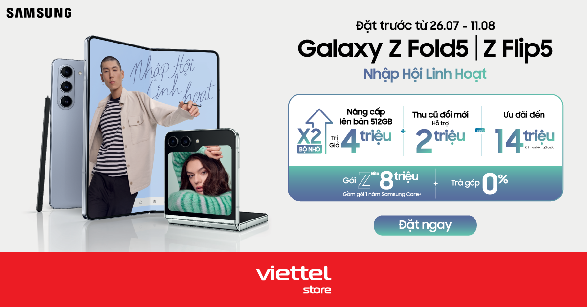 Tại Viettel Store, Samsung Galaxy Z Fold5| Z Flip5 đang nhận đặt hàng từ 26/07 đến hết 11/08/2023 và dự kiến sẽ trả hàng sớm vào ngày 11/08 tới đây. Theo đó, tất cả khách hàng đặt trước bộ đôi máy gập đều được giảm ngay 4.000.000đ (ưu đãi nâng cấp bộ nhớ từ 256GB lên 512GB), thu cũ đổi mới trợ giá lên đến 2.000.000đ hoặc tặng PMH trị giá 500.000đ. Ngoài ra, tặng kèm gói ưu đãi cao cấp Z Elite trị giá lên đến 8 triệu đồng.