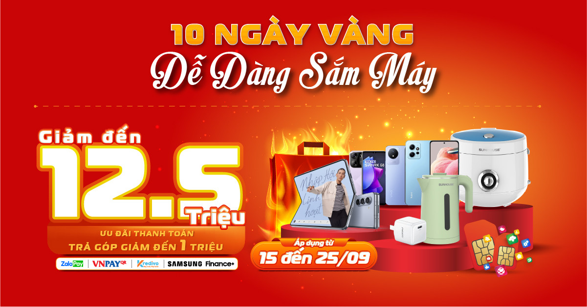 Các sản phẩm có khuyến mại hấp dẫn như Galaxy S23 Ultra 8/256GB giá chỉ còn 21.490.000 khi trả góp qua Samsung Finance+, áp dụng từ 15 – 20/9; Vivo Y02T (4+64GB) giá chỉ còn 2.890.000đ khi trả góp qua Kredivo; Oppo Reno10 5G 256GB giá chỉ còn 9.790.000đ khi trả góp qua Kredivo, áp dụng từ 15 – 17/9; Redmi Note 12 8/128GB giá chỉ còn 4.490.000 khi trả góp qua Kredivo và nhiều sản phẩm phụ kiện chỉ từ 15.000đ, đồng hồ định vị cho trẻ em đồng loạt giảm giá trong 10 ngày vàng và phục vụ sức mua các sản phẩm phục vụ học tập trong tháng 9 tựu trường.