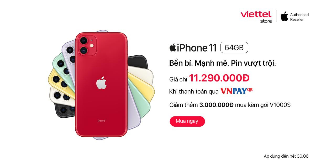 Cụ thể, xuyên suốt tháng 6, trên mức giá ưu đãi của iPhone 11 64GB chỉ 12.290.000đ, khách khi thanh toán qua VNPAY-QR, nhập mã VTHOT1TR giảm thêm 10% tối đa 1.000.000đ. Mức giá cuối cùng sau khi thanh toán qua VNPAY-QR chỉ còn 11.290.000đ kèm những ưu đãi hấp dẫn khác.