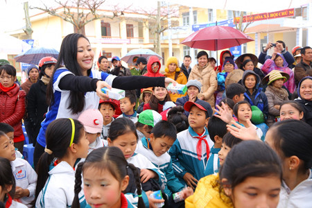 Hoa hậu Ngô Phương Lan, đại sứ của chương trình Quỹ sữa Vươn Cao Việt Nam, trao sữa cho trẻ em huyện đảo Cô Tô, Quảng Ninh