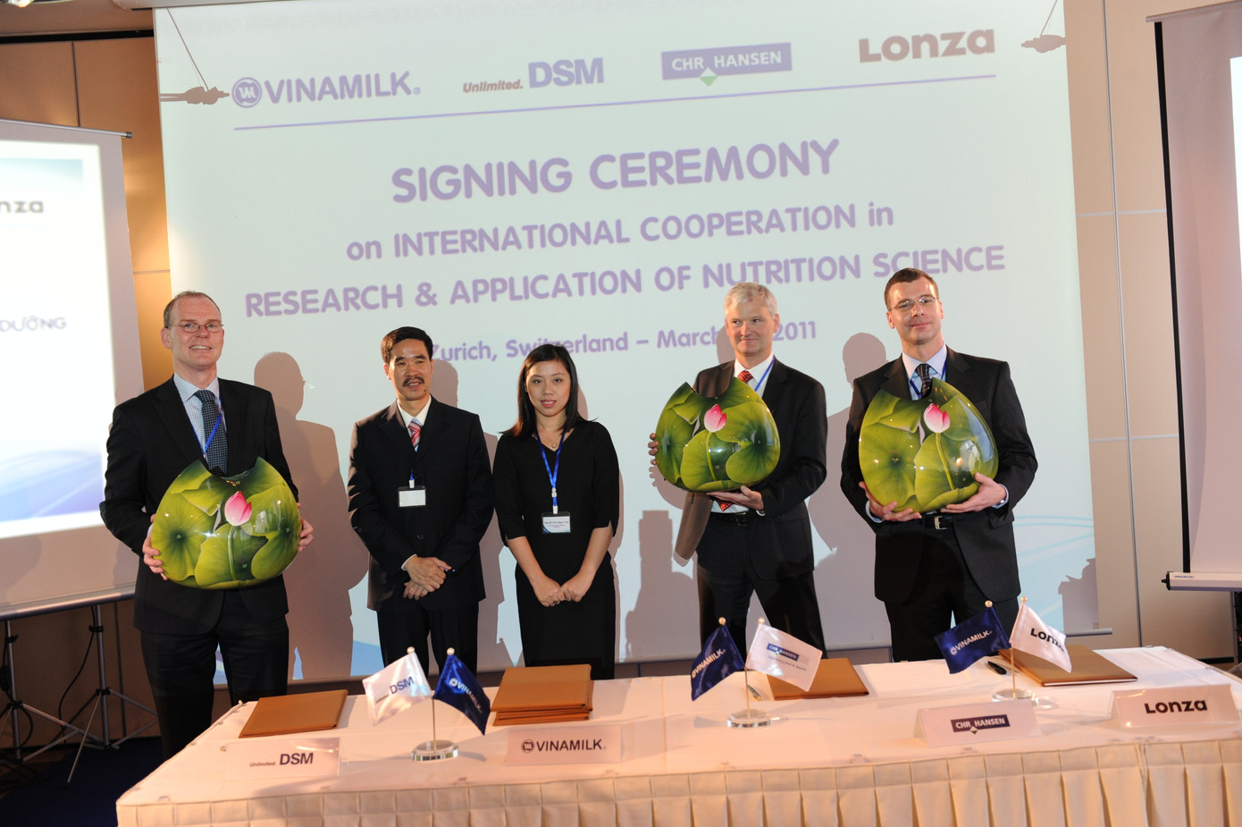 Ba đối tác gồm: Tập đoàn DSM - Thuỵ Sĩ; Công ty Lonza - Thuỵ Sĩ và Tập đoàn Chr. Hansen - Đan Mạch. Đây là các đối tác có quan hệ hợp tác với Vinamilk trong nhiều năm thông qua các ứng dụng khoa học vi chất, vi sinh cho các sản phẩm sữa tươi, sữa chua và đặc biệt là sữa bột dưới thương hiệu Dielac như Dielac Alpha, Dielac Mama,…