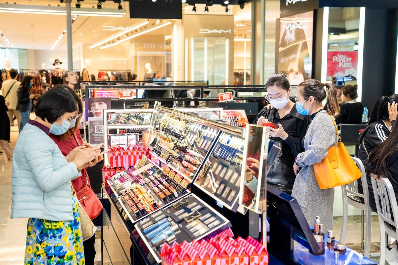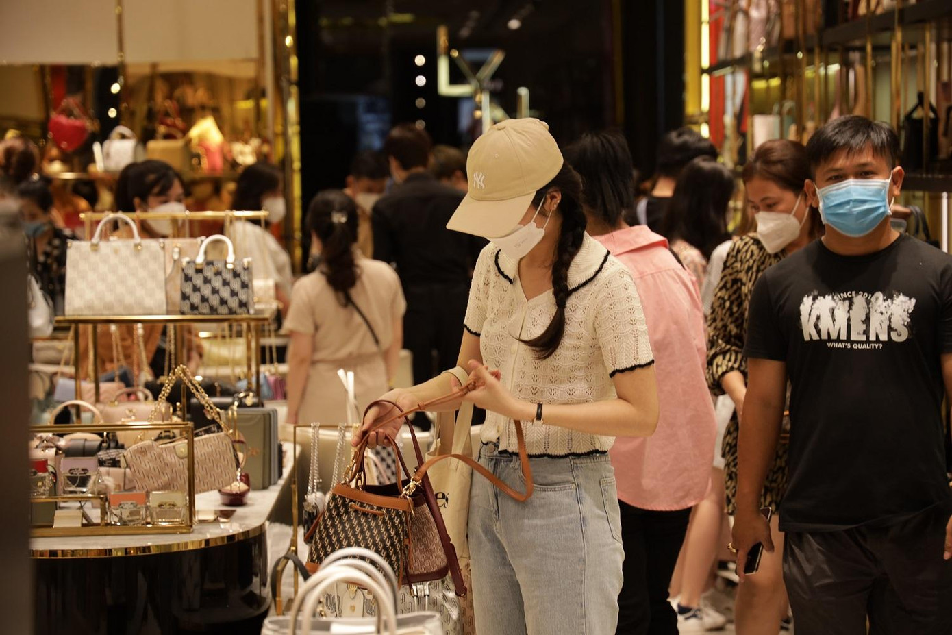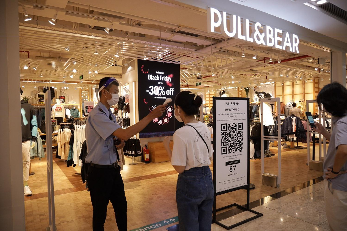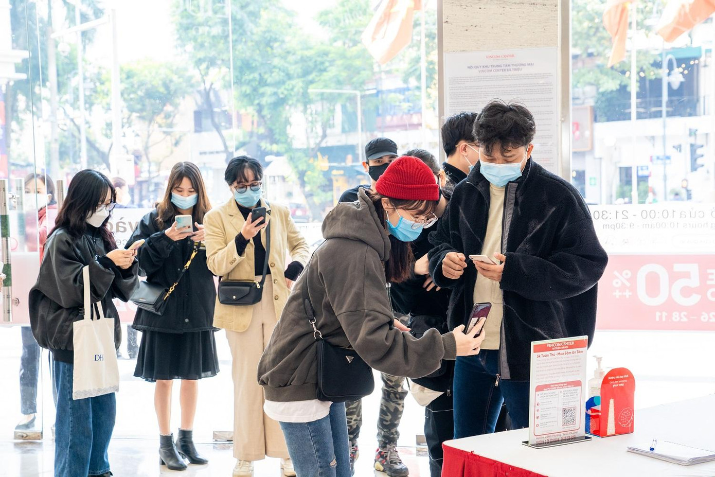 Dù lượng người đến “săn sale” ngày càng đông nhưng các TTTM vẫn tuân thủ nghiêm ngặt quy trình để kiểm soát, phòng chống dịch bệnh. Ghi nhận tại TTTM Vincom Bà Triệu, toàn bộ khách hàng và nhân viên đều phải đeo khẩu trang, xếp hàng đảm bảo giãn cách, quét mã QR khai báo trước khi vào TTTM và các gian hàng,… .