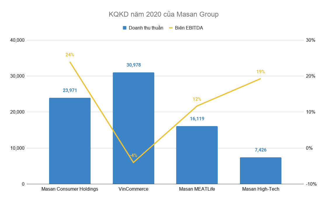 Điểm đáng chú ý nhất của Masan Group trong quý 4/2020 có lẽ đến từ việc công ty con VinCommerce đã đạt EBITDA dương 16 tỷ đồng, tương ứng tỷ suất 0,2%. Tuy chưa phải là con số cao, nhưng nó đánh dấu một cột mốc quan trọng đối với mảng bán lẻ của Masan Group, tạo tiền đề cho công cuộc chuyển đổi của năm 2021.