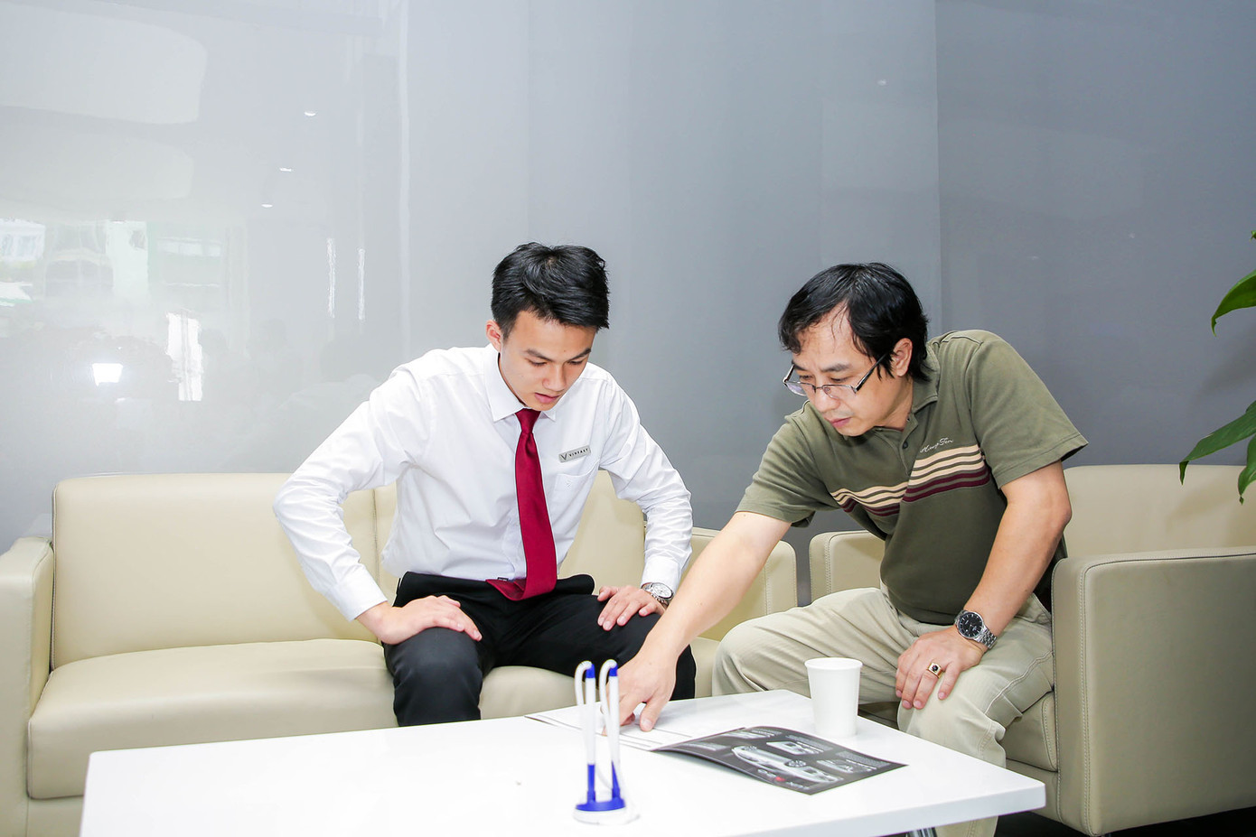 Đội ngũ chăm sóc khách hàng, tư vấn viên sẽ luôn đồng hành cùng khách hàng trong suốt quá trình tham quan và trải nghiệm showroom, sẵn sàng lắng nghe, chia sẻ và giải đáp bất cứ khúc mắc nào từ phía khách hàng trong quá trình xem xét và lựa chọn xe