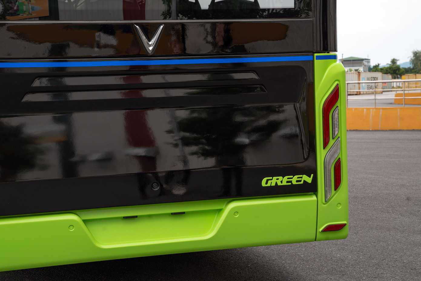 Logo chữ “V” đặc trưng, biểu tượng cho hãng xe Việt xuất hiện ở cả phía trước và sau xe. Đáng chú ý, phía đuôi xe buýt điện còn có chữ “Green” gắn nổi rất dễ nhận biết ở góc dưới cùng bên phải biểu tượng cho sự thân thiện với môi trường - “Vì tương lai xanh” mà hãng xe Việt hướng đến khi quyết định sản xuất các sản phẩm xe điện. Điều khác biệt, ấn tượng lớn nhất của xe buýt điện VinFast là không phát thải, không gây tiếng ồn. Khách đi xe cũng như những người cùng tham gia giao thông sẽ không cảm thấy bị say xe hay khó chịu bởi mùi xăng dầu, tiếng ồn như xe buýt thông thường.