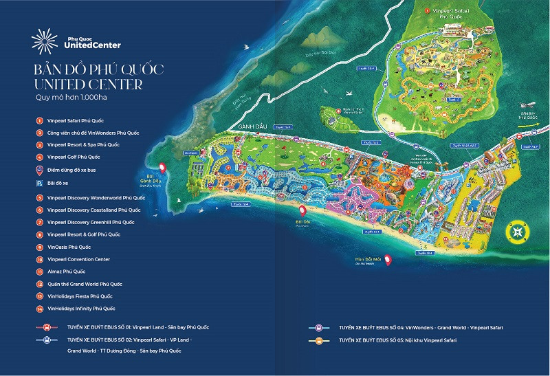 Phú Quốc United Center có tổng vốn đầu tư hơn 66.000 tỷ đồng, được phát triển theo mô hình “một điểm đến mọi nhu cầu”, gồm hệ thống các thương hiệu khách sạn từ Mini Hotel đến các thương hiệu 5 sao như Vinpearl, VinOasis, VinHoliday, Radison Blue… với hơn 10.000 phòng; Công viên chủ đề lớn nhất Việt Nam VinWonders Phú Quốc; một trong những Công viên bảo tồn động vật bán hoang dã lớn nhất châu Á Vinpearl Safari; Sân gôn 18 hố Vinpearl Golf; Corona Casino 5 sao, Thành phố mua sắm giải trí không ngủ Grand World; Bệnh viện Vinmec...