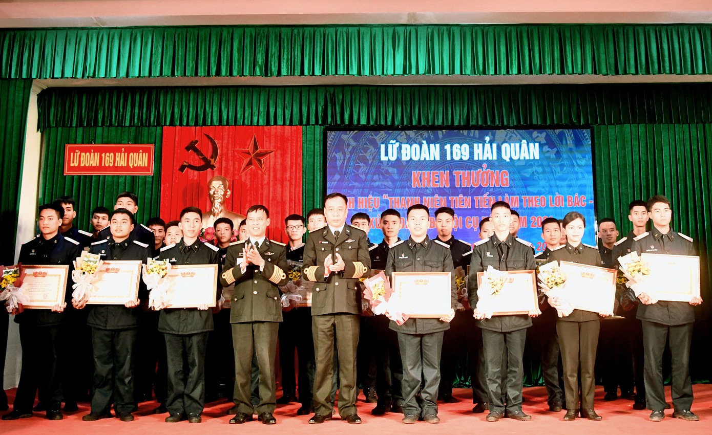 | Tại buổi gặp mặt, Đại tá Hoàng Ngọc Tuấn - Lữ đoàn trưởng Lữ đoàn 169 và Đại tá Trần Quốc Huy - Chính ủy Lữ đoàn 169 đã trao thưởng các cá nhân đạt danh hiệu “Thanh niên tiên tiến làm theo lời Bác”. |