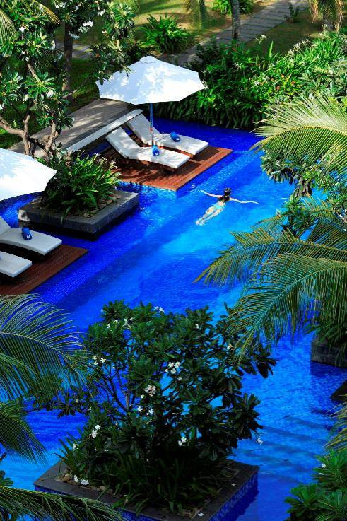 Từ biệt thự hoặc khách sạn đều di chuyển thuận tiện ra hệ thống hồ bơi tràn bờ lớn, dưới các tán cây nhiệt đới xanh mát