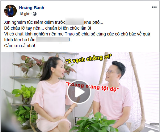 Mới đây, trên trang cá nhân của Hoàng Bách liên tục chia sẻ các bài viết liên quan đến việc bà xã của nam ca sĩ mang bầu lần 3. Cụ thể, giọng ca “Vệt nắng cuối trời” dí dỏm viết :“ Xin nghiêm túc kiểm điểm...Bố cháu lỡ tay nên... chuẩn bị lên chức lần 3! Vì có chút kinh nghiệm nên mẹ Thảo sẽ chia sẻ cùng các cô chú bác về quá trình làm bà bầu trên kênh này ạ” (Ảnh: FBNV).