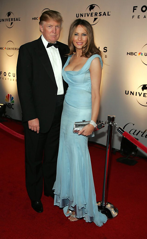 Ở sự kiện Quả Cầu Vàng 2007, Melania chọn váy khoe ngực. Trong khi đó, Donald Trunp vẫn trung thành với cách mặc suit cổ điển.