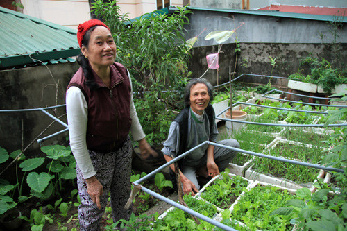 Ngôi nhà bốn tầng rợp rau xanh trên phố Đội Cấn là nơi ở của vợ chồng ông Đinh Xuân Toàn (72 tuổi) và bà Lê Thị Xuân (66 tuổi). Ông bà thích trồng rau xanh nên mọi nơi trong nhà đều được tận dụng. Những luống rau mùa đông như bắp cải, su hào, cà chua xanh mơn mởn.