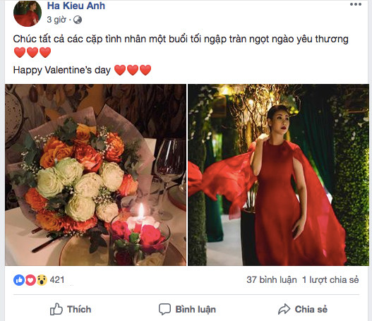 Hoa hậu Hà Kiều Anh khoe bữa tối lãng mạn với ông xã vào ngày Valentine.