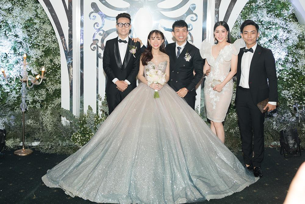 Trong hôn lễ, vợ chồng Khánh Thi ngồi cùng bàn tiệc với Ưng Hoàng Phúc, Phạm Quỳnh Anh, Trấn Thành và Soobin Hoàng Sơn.